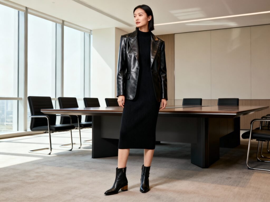 Black knit dress + leather blazer + ankle boots: Downtown energy, boardroom polish.