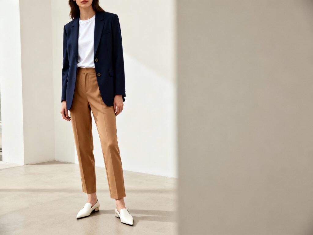 Navy blazer + ivory tee + camel trousers + pointed flats: Monochrome-adjacent and crisp.