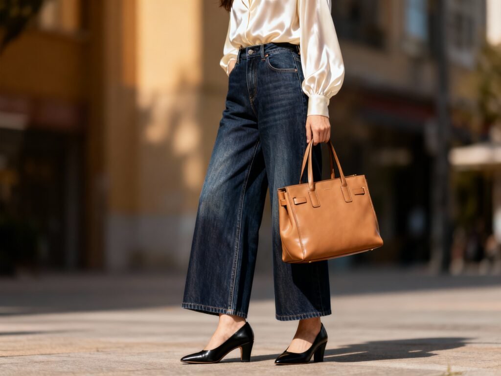 Silk blouse + wide-leg jeans + slingbacks + structured bag: Elevated off-duty.