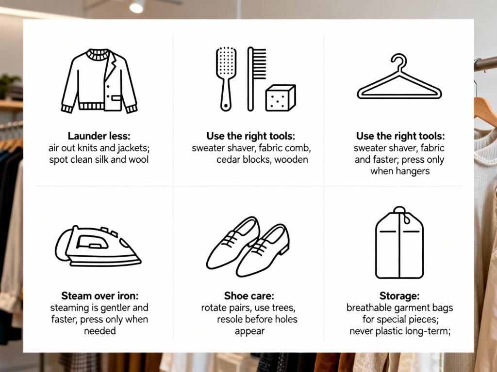 - Use the right tools: sweater shaver, fabric comb, cedar blocks, wooden hangers.