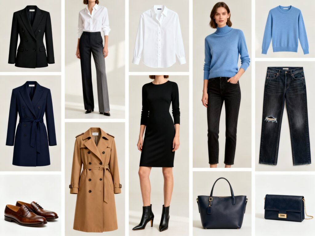 - Shoes: leather loafers, sleek ankle boots, simple pumps.