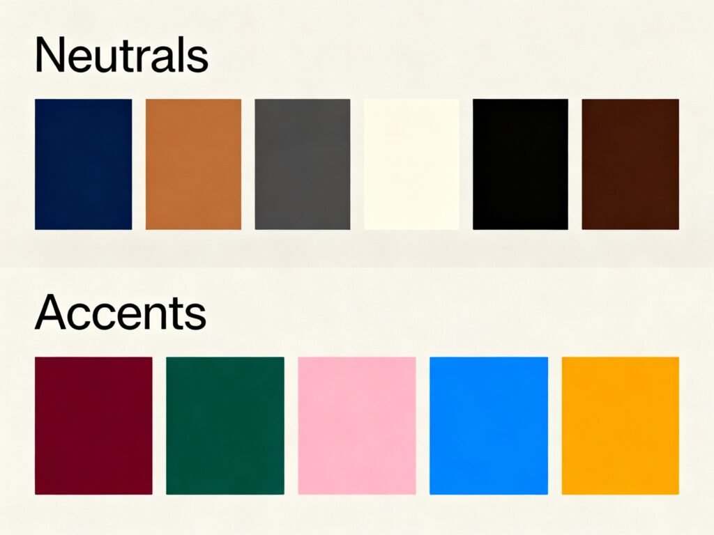 - Neutrals: navy, camel, charcoal, ivory, black, chocolate