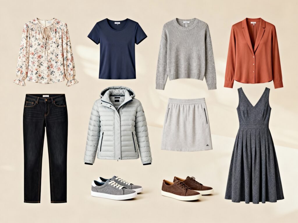 Aim for a 7-day capsule and plan one laundry session. That usually means 5-6 tops, 2-3 bottoms, 1 dress/jumpsuit or blazer, 2-3 pairs of shoes, and 2-3 layers. With a tight color palette, you’ll create 12-15 outfits without feeling like a cartoon character.