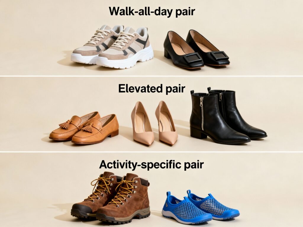 - Shoes: 2-3 pairs max (walkable sneaker, smart casual shoe, activity-specific shoe)