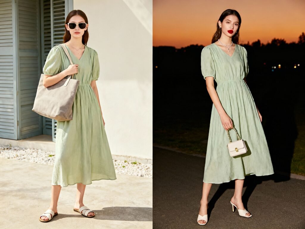 - Night: Heeled mules, micro bag, bold lip, delicate jewelry
