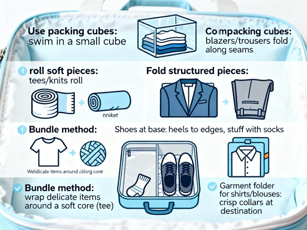- Bundle method for wrinkle-prone pieces: Wrap delicate items around a soft core layer (like a tee) to reduce creases.