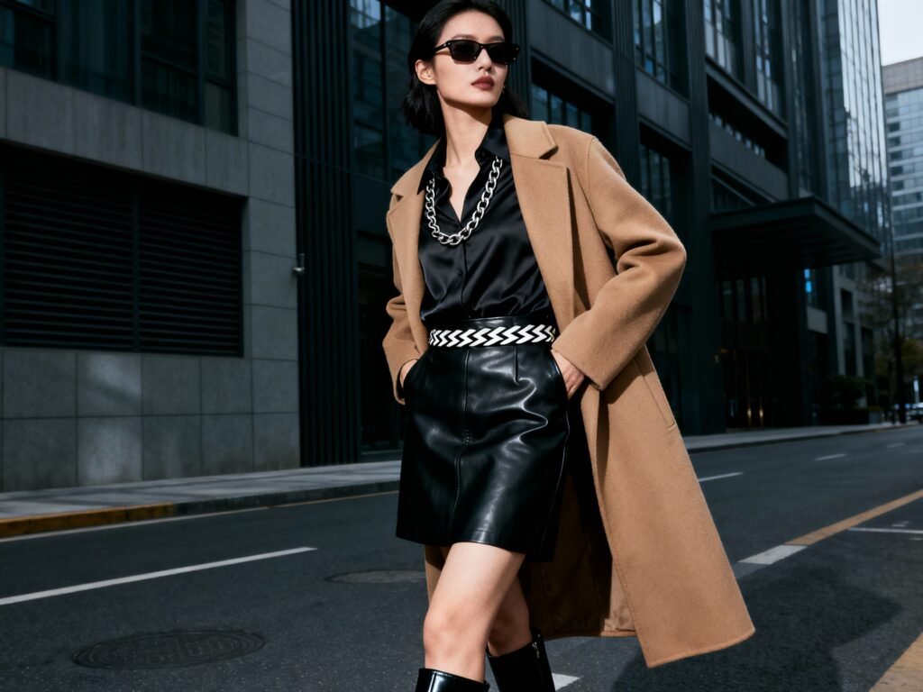 - Black leather skirt + silk blouse + camel coat.Finish with a herringbone chain and knee boots. Chic mob energy.
