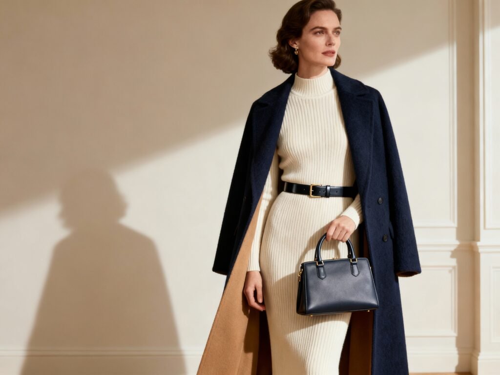 - Fitted knit dress + long wool coat + sleek belt. Carry a structured top-handle.Old money meets main character.
