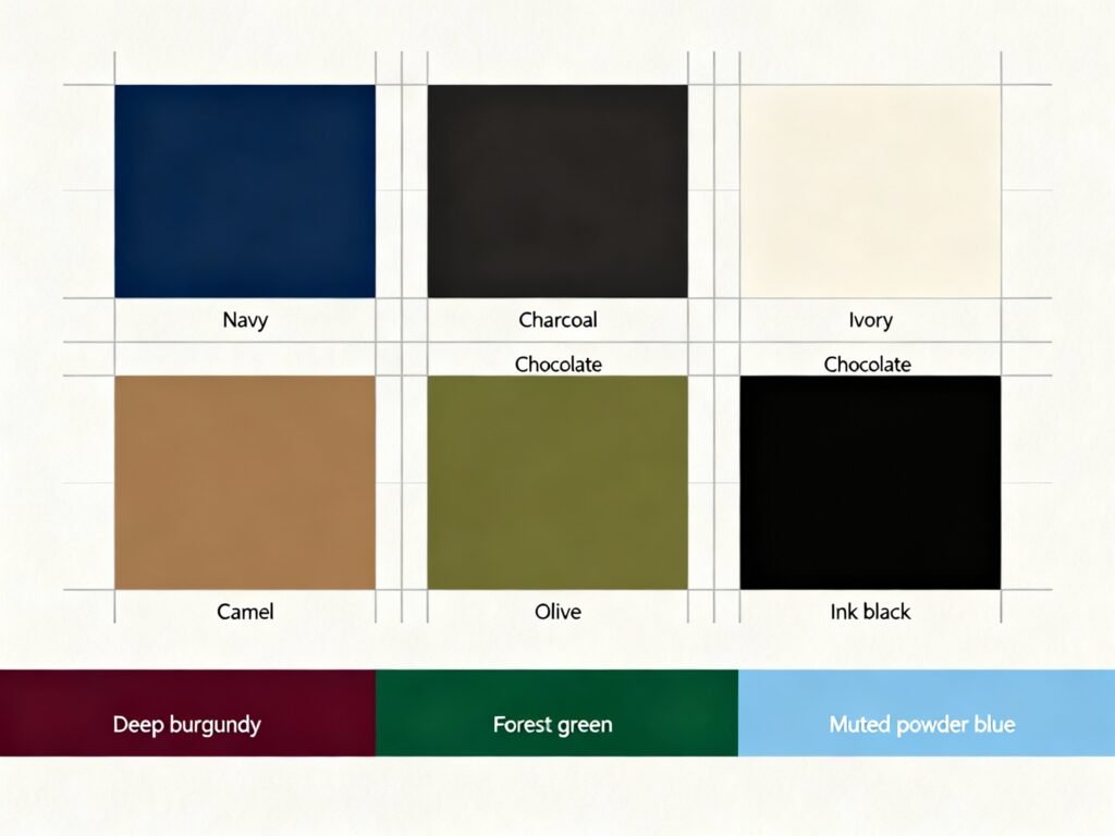- Core colors: Navy, charcoal, ivory, chocolate, camel, olive, ink black.