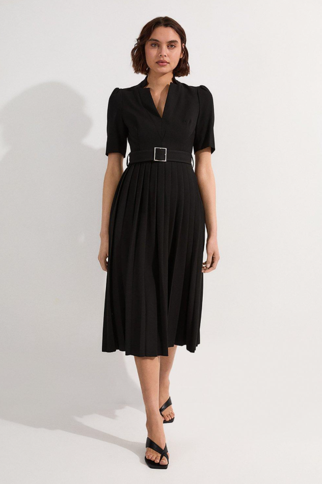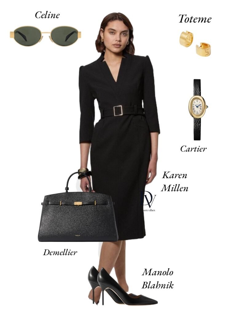 I chose this gorgeous black belted tailored dress to style it with sleek pumps and an elegant tote for a professional and feminine look.
