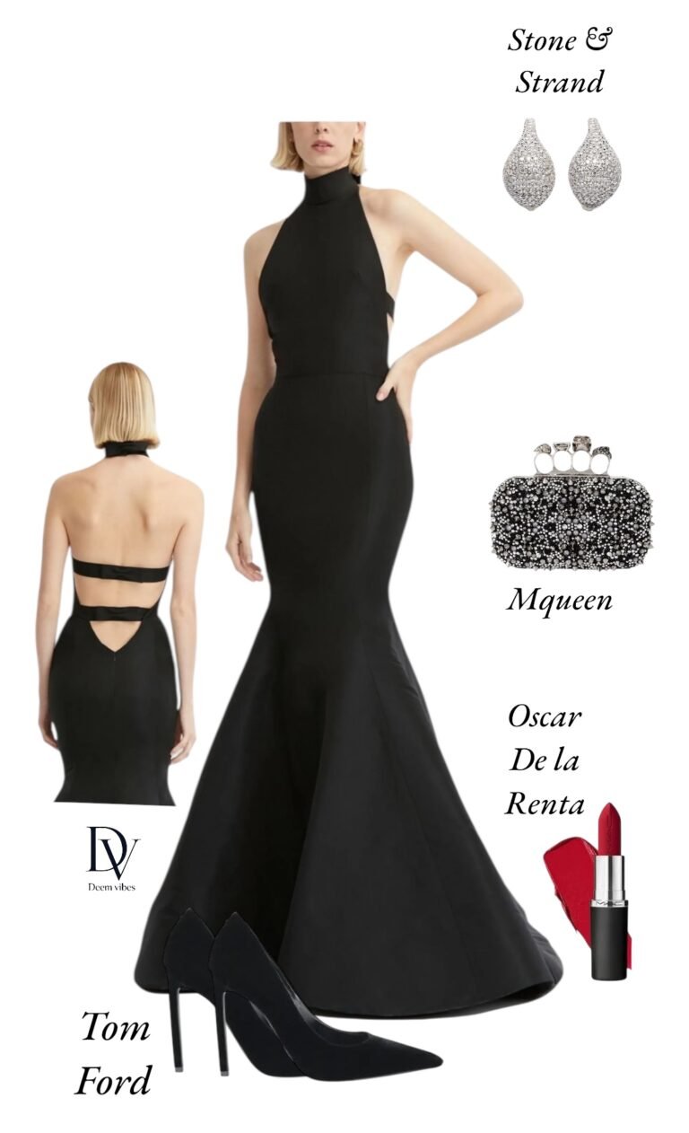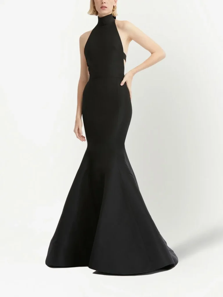 A sleek black halter-neck mermaid gown that hugs the waist and hips before flaring into a dramatic train. The back features a chic cutout detail, adding modern edge to the classic silhouette. Pair with sparkling diamond drop earrings, a beaded evening clutch, and glossy red lipstick, finished with black pointed-toe stilettos for a flawless red-carpet landing.