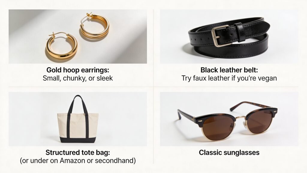 Understated accessories: Think gold hoops, leather belts, sleek flats