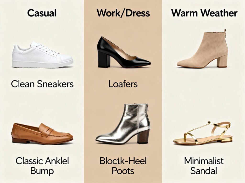 For a streamlined start: one clean sneaker, one loafer or flat, one ankle boot, and one dress shoe/sandal. Four pairs cover 90% of life.
