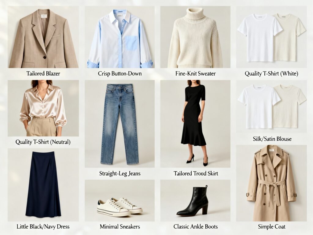 This isn’t a shopping list to buy in one shot. Fill gaps slowly. Buy the versions that feel good on your body right now, not aspirational sizes—because nothing looks chic if it pinches.