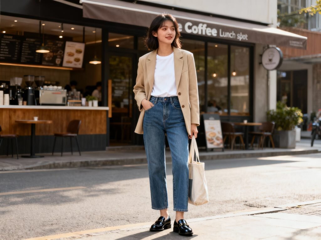 - Blazer + tee + straight jeans + loafers (errands to lunch)