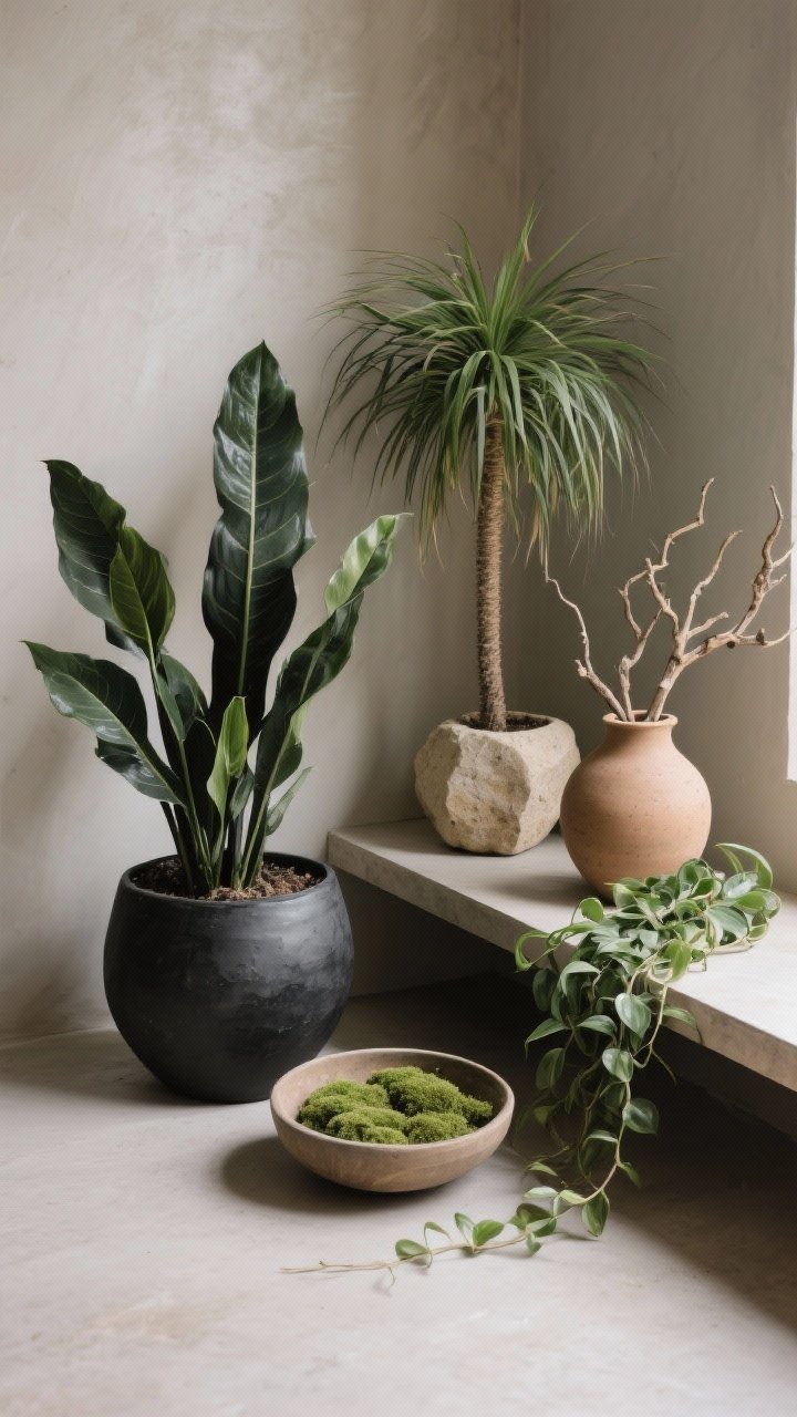 - Forest Vibes: Rubber plant, trailing pothos, or a ZZ plant for low-light corners.