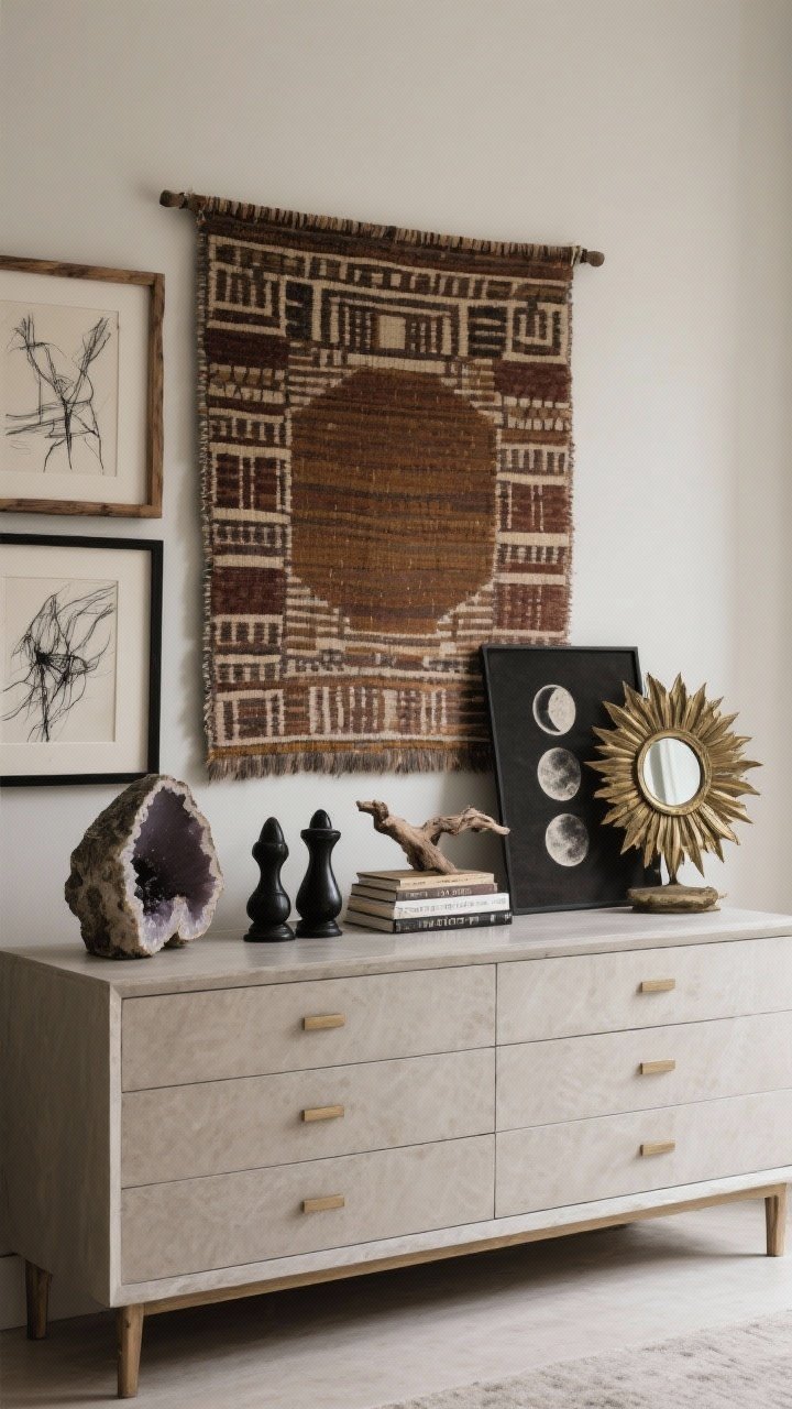 - Textiles: A block-printed tapestry or hand-loomed wall hanging in earthy tones.
