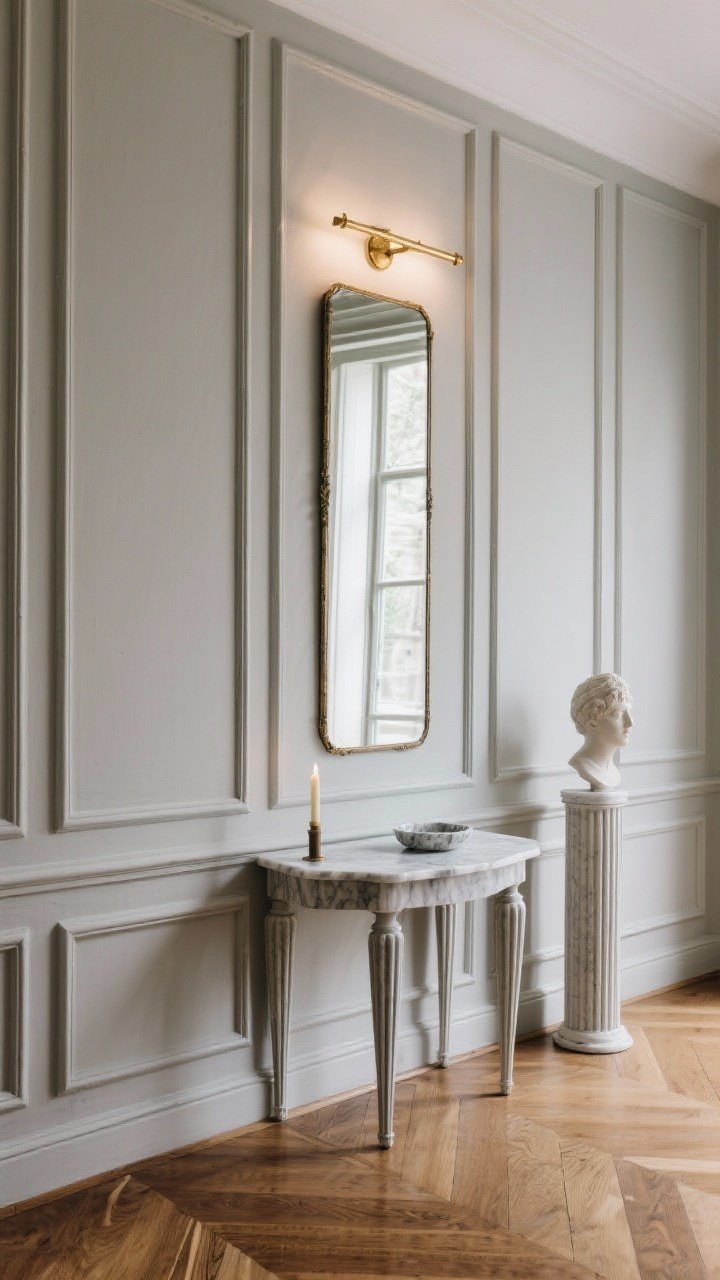 The mirrored repeats and refined molding stack visual layers, making the hallway feel longer, richer, and impossibly chic.