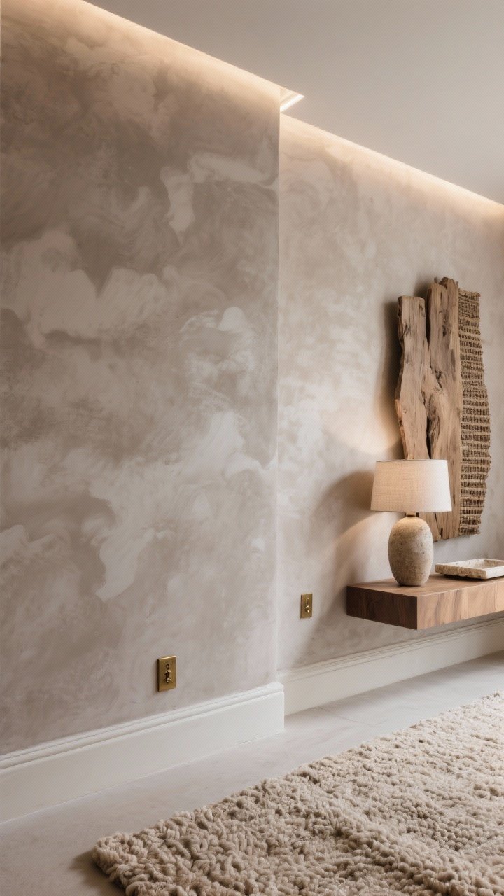 Add concealed LED cove lighting along one side of the ceiling to skim light down the wall. That grazing effect throws gentle shadows across the limewash texture. A chunky wool runner in oatmeal brings softness underfoot.