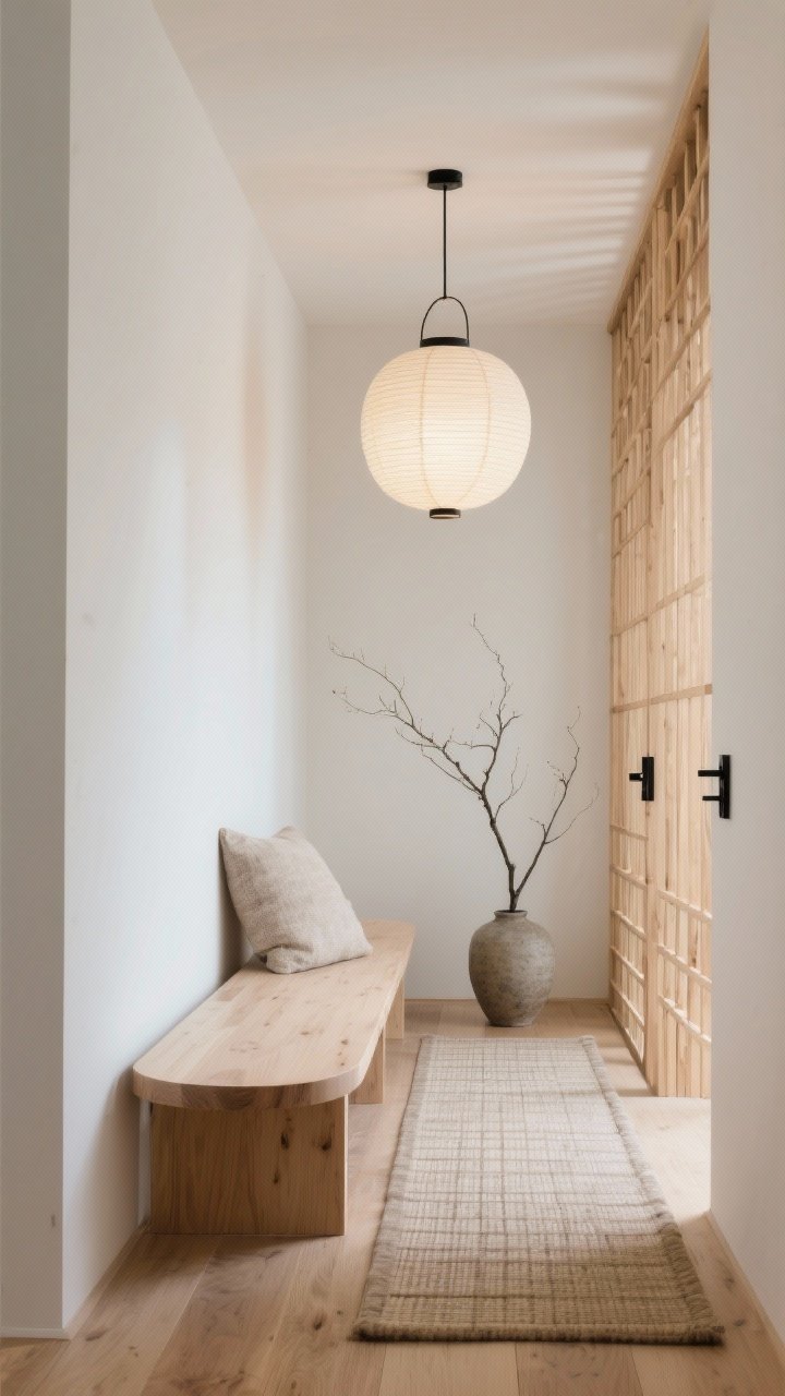 Choose a low-profile bench with rounded edges in pale wood, paired with a pillow in textured linen. Add a large paper lantern ceiling light for diffused, even illumination. Keep decor minimal—one stoneware vase, one branch, done.