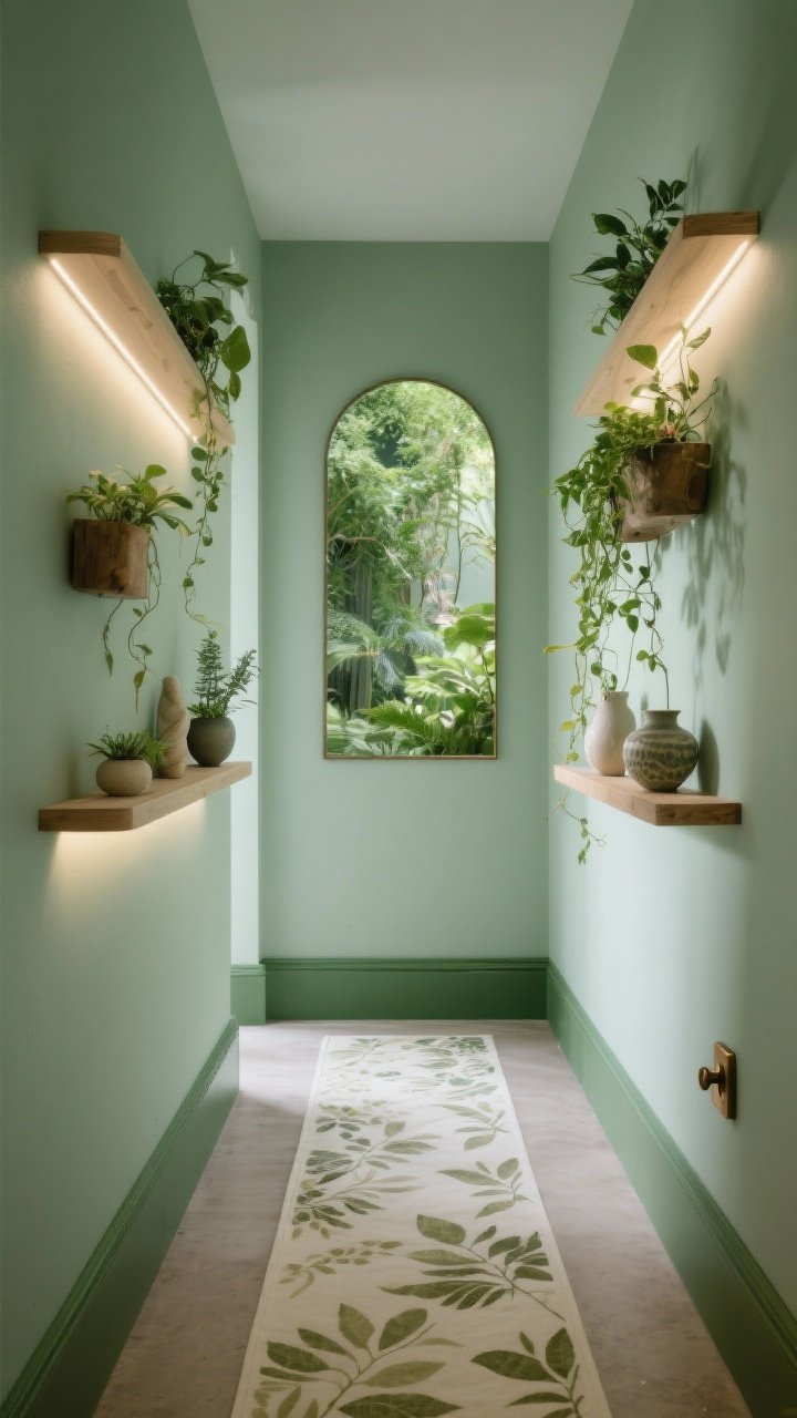 Bring the outdoors in to soften a tight corridor. Start with a tranquil sage green on walls and a tonal, slightly darker green on baseboards for subtle grounding. Add slender floating ledges in light ash wood for small plants and sculptural ceramics.