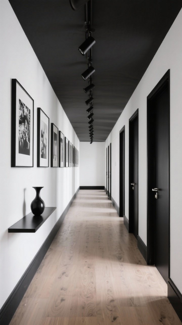 Line the wall with black-and-white photography in identical thin black frames. Keep spacing exact, and hang at eye level to form a visual corridor. A slim console shelf in black disappears against the baseboards while giving you a landing spot for a single sculptural vase.