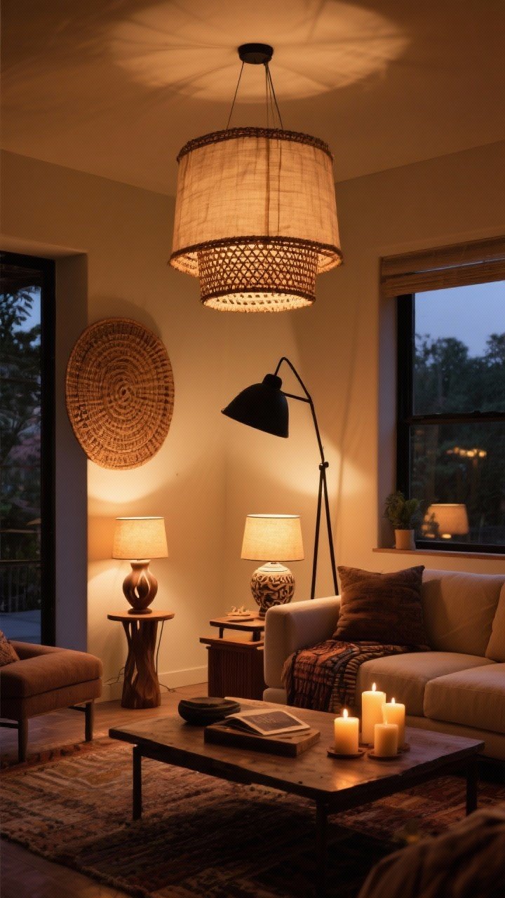 - Ambient: A linen drum pendant or woven rattan shade for soft, diffused light.