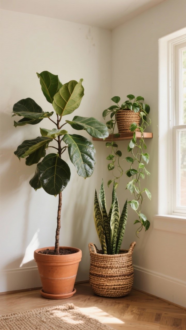 Style your plants in woven baskets and clay pots. Mix heights: a tall floor plant, a medium tabletop plant, and a trailing one. Boom—instant balance.