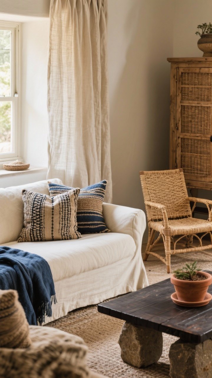 - Softs: Mudcloth pillows, indigo-dyed throws, cotton slub curtains.