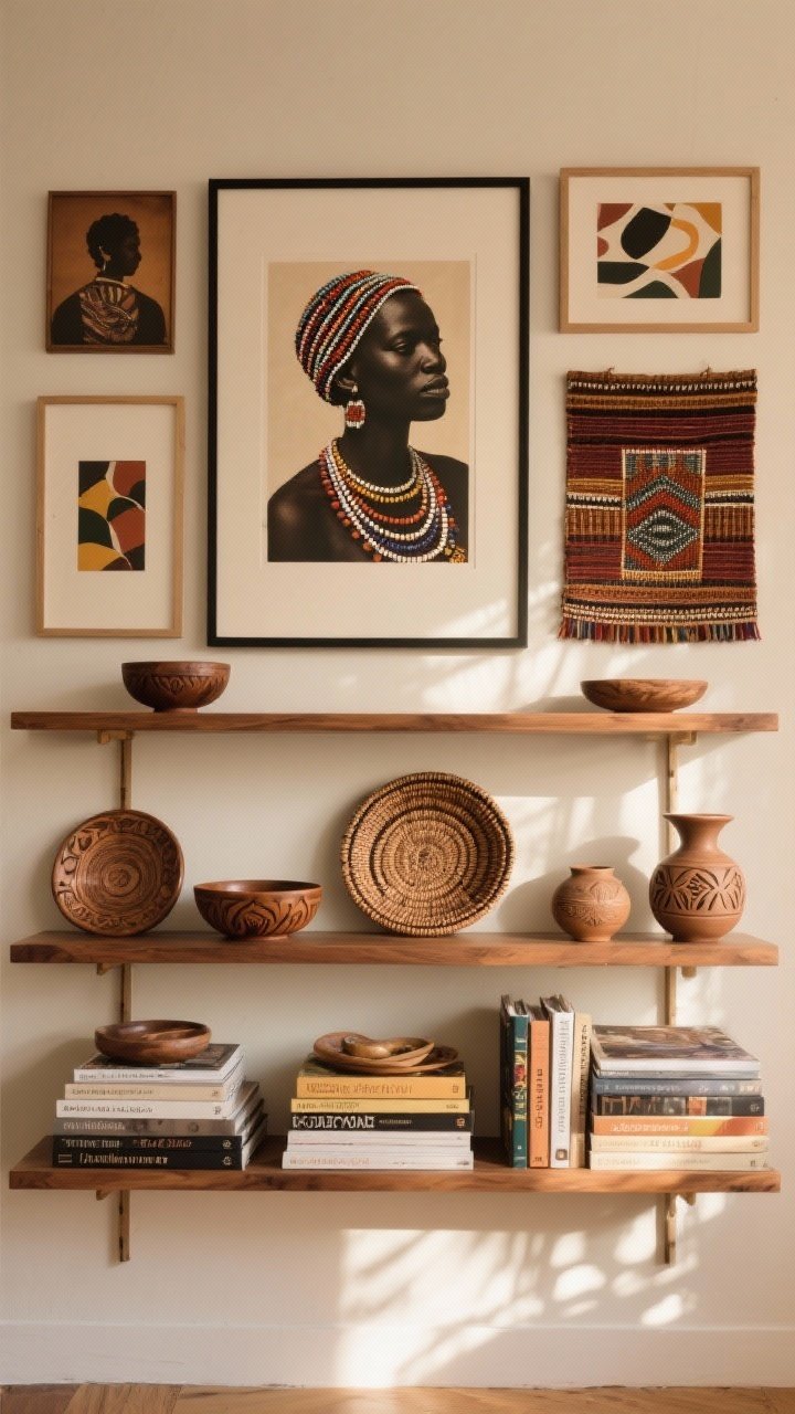 - Wall moments: A gallery wall with African portraiture, abstract prints, and framed textiles.