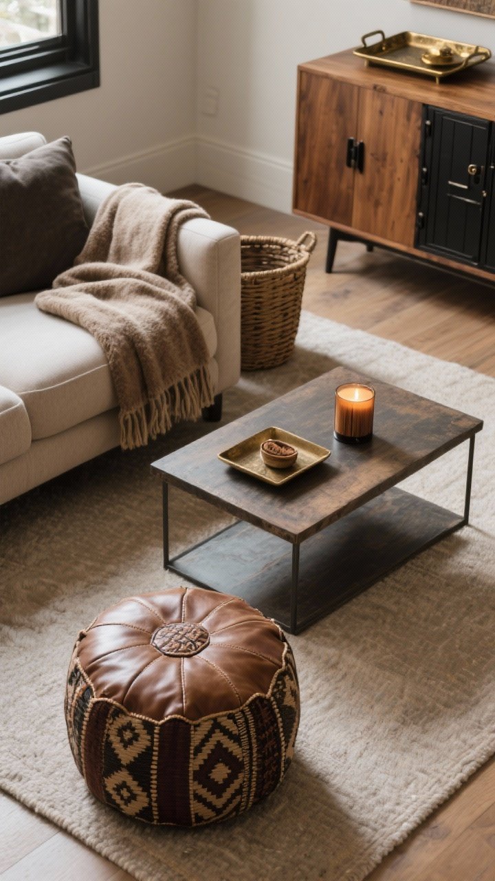- Ottomans and poufs: Add mudcloth poufs or leather ottomans for extra seating that doubles as footrests.