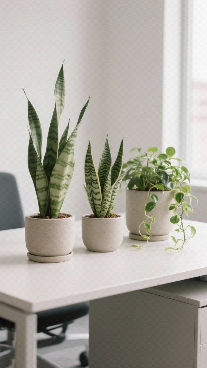 Display them in neutral planters—matte ceramic or light concrete. Keep it to 1–3 plants so your desk doesn’t become a jungle. If you’re forgetful, set a weekly calendar reminder to water. You’re welcome.