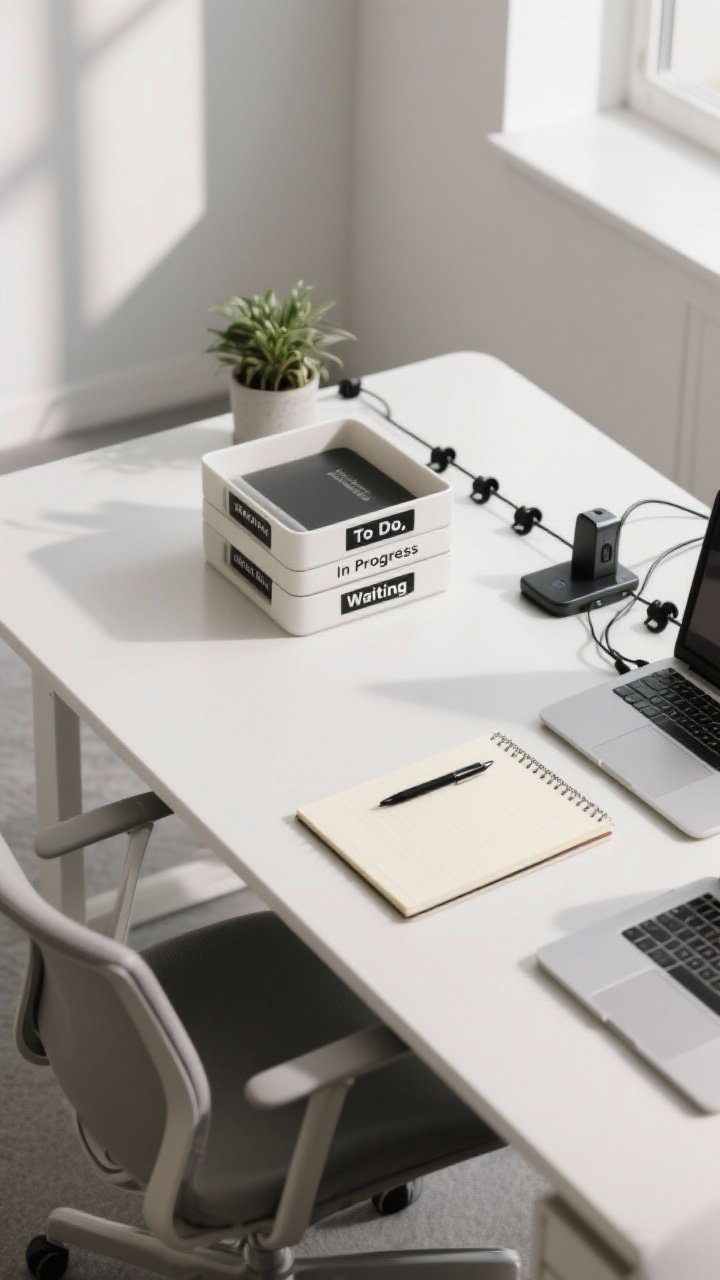 - Clear surfaces: Put papers in labeled trays: To Do, In Progress, Waiting.