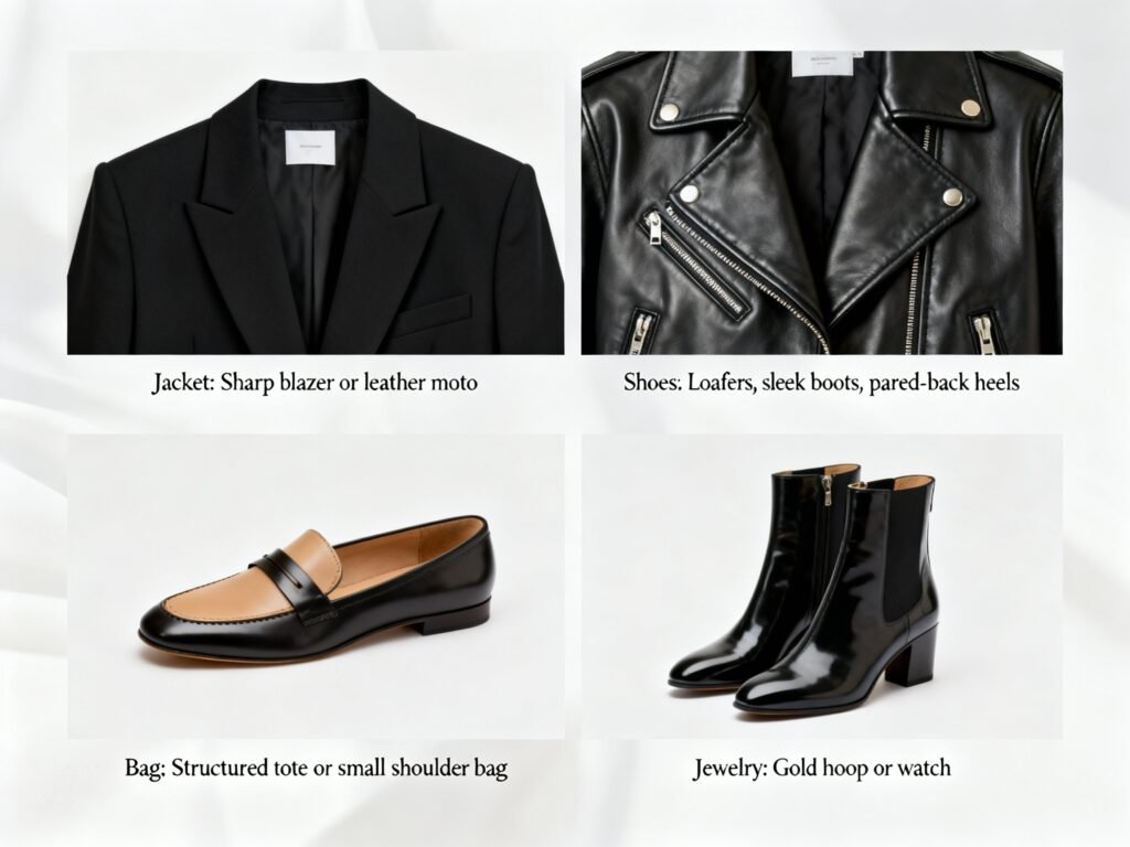 - Jacket: A sharp blazer or leather moto does the heavy lifting.
