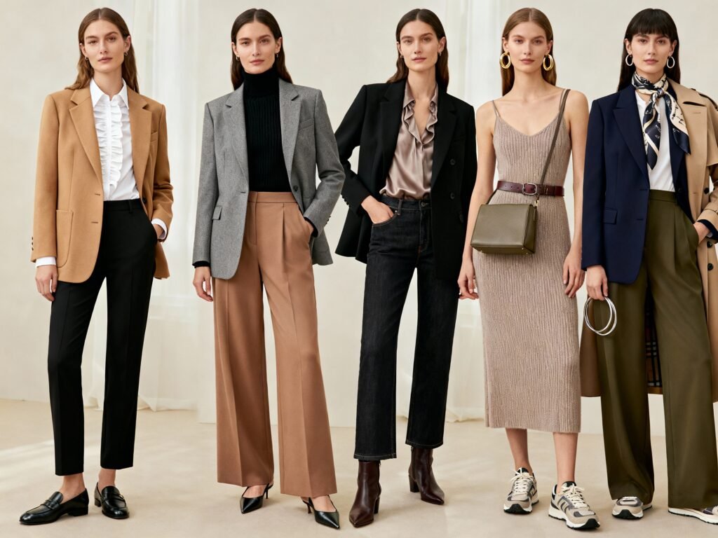 - Shoes: loafers, pointed flats, ankle boots, elegant sneakers.