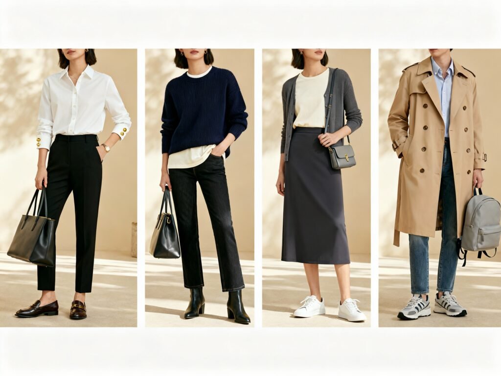 - Shoes: leather loafers, ankle boots, sleek white sneakers (clean, not gym-grade).