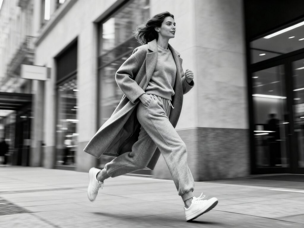 - Errand Elevated: monochrome sweatsuit in a refined fabric + long coat + clean sneakers.