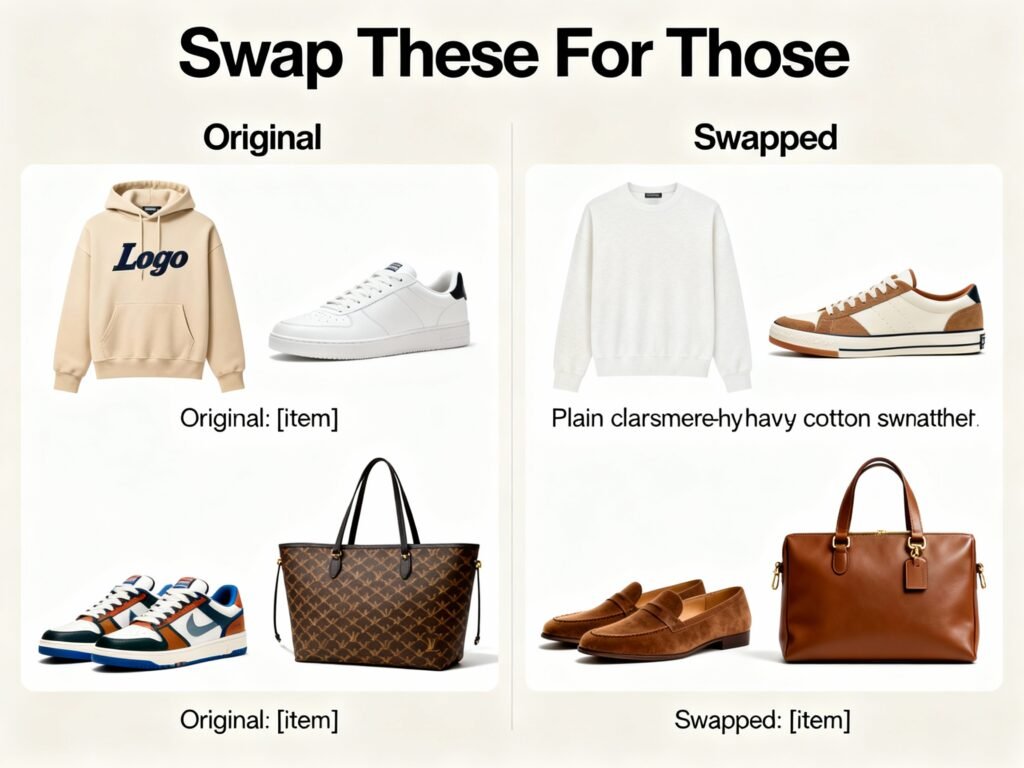 - Swap a logo hoodie for a plain cashmere or heavy cotton sweatshirt.