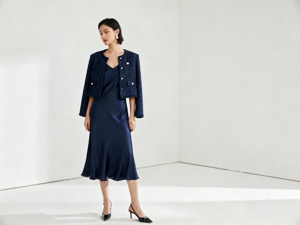 - Tweed and boucle: Soft texture, serious energy.Pair with a slip skirt for contrast.