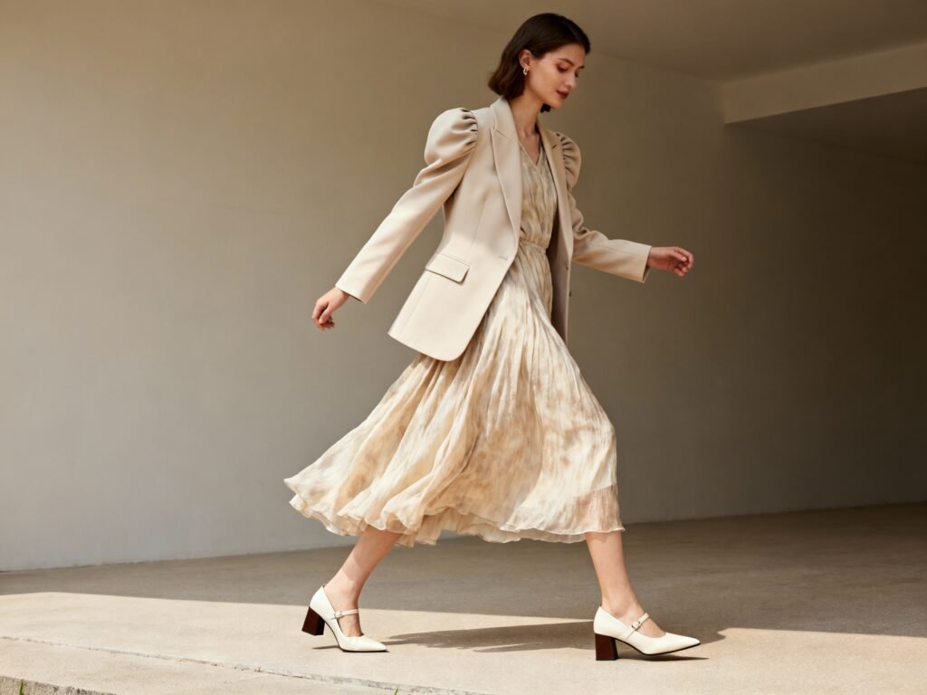 - Shoes: Pointed-toe flats, slingbacks, or block-heel pumps = instant authority. Nude-to-you shades lengthen the leg without screaming.