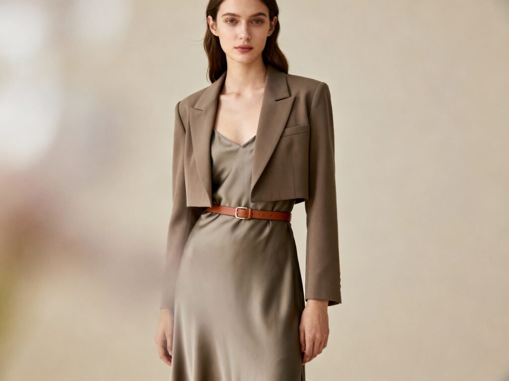 - Fitted + Fluid: A structured blazer over a slip dress balances sweet and strategic.