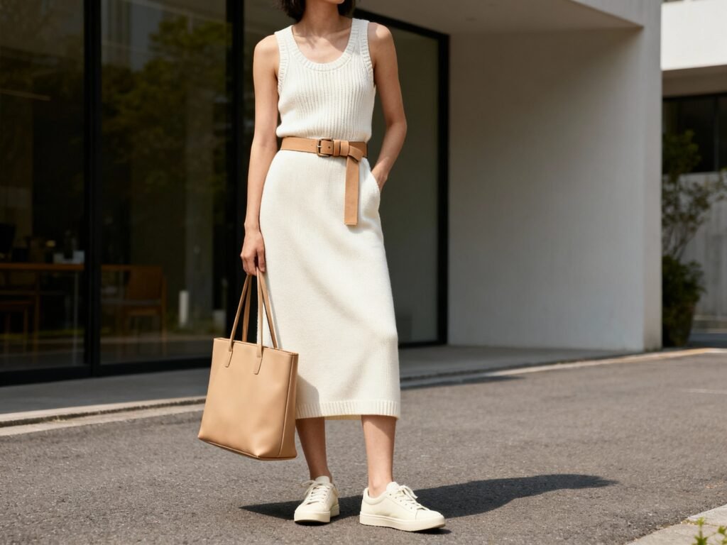 Team Offsite: Ivory knit set (tank + midi skirt) + tan belt + cream sneakers + structured tote. Cozy, but in charge.