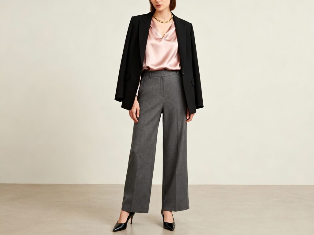 Client Pitch: Blush silk blouse + charcoal wide-leg trousers + black blazer + pointed pumps. Add a thin gold chain.