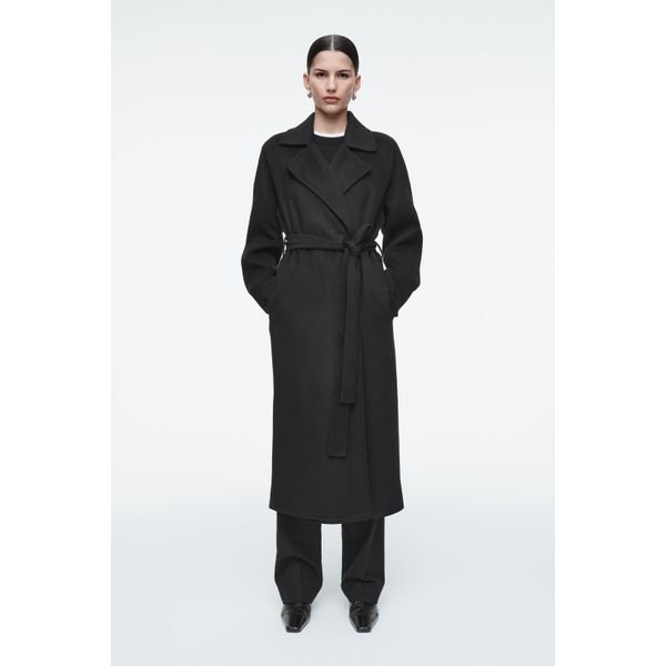 Long wool or pea coat with fitted tailoring.