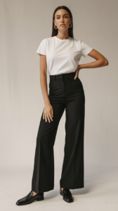 - Formula 1: White tee + black wide-leg trousers + black loafers + gold hoops.