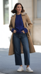- Formula 2: Navy sweater + straight dark denim + tan trench + white sneakers.