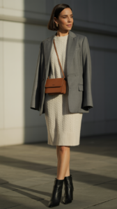 - Formula 3: Cream knit dress + structured blazer + ankle boots + minimal crossbody.