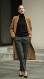 - Formula 4: Black turtleneck + camel coat + gray trousers + pointed flats.