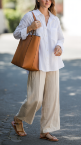 - Formula 5: Linen shirt + beige pants + leather sandals + tote. Weekend luxury unlocked.