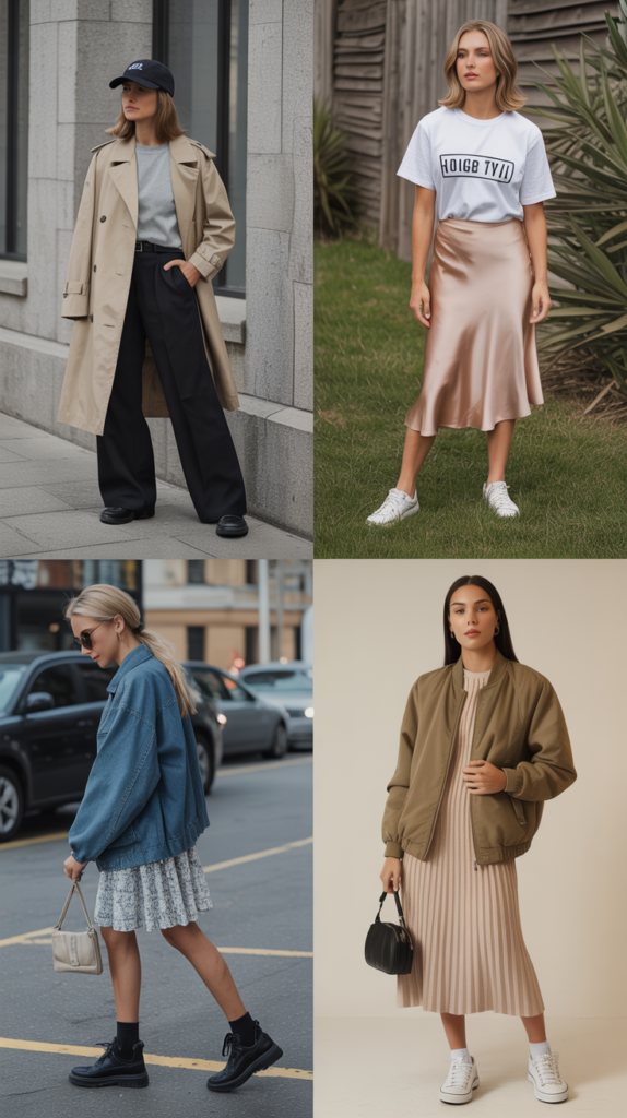 - Satin midi + boxy tee + dad sneakers for casual polish
